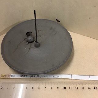 笹岡基三作の皿型・線香立て 直径13.5cm×高さ2cm 紫泥の焼き締め炻器 中央部の線香を立てる箇所に狸の細工